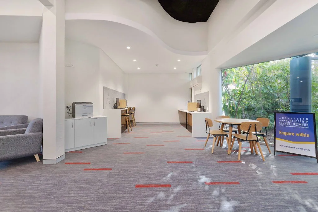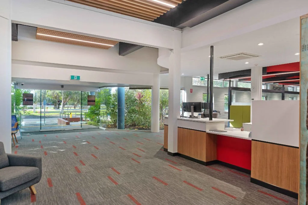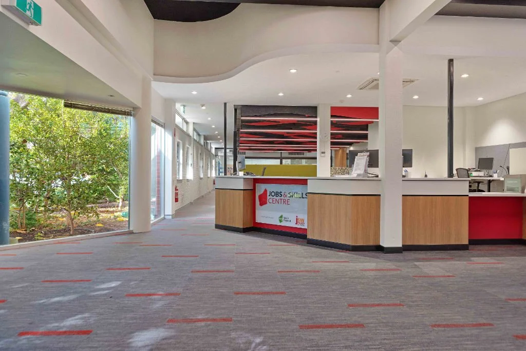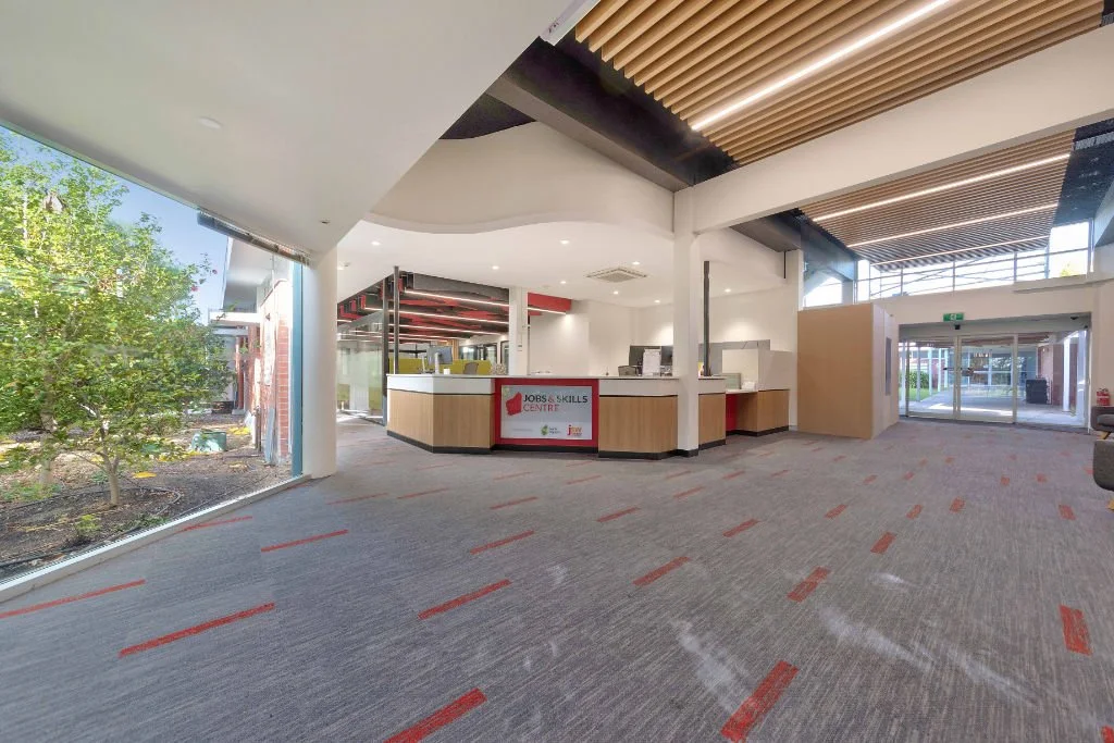 Resicom was engaged to remodel and fit out the TAFE Jobs and Skills Centre at South Regional TAFE's Bunbury campus. The project involved refurbishing and upgrading the existing Student Services Centre to create a modern, functional service hub. Key enhancements included the addition of a new main entrance, reception area, meeting rooms, pod spaces, workstations, and an upgrade to the ICT infrastructure.